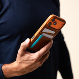 Discover the ultimate blend of luxury and functionality with our fully wrapped in leather iPhone 17 Pro Card Holder Case in Saddle Tan. Expertly crafted from premium full-grain leather, this sleek iPhone 17 Pro wallet case features double card slots and an organic cotton elastic finger loop for on-the-go organization and secure grip. With its elegant design and top-notch materials, it's no wonder this case is one of the most acclaimed and reviewed iPhone 17 wallet cases in the market.