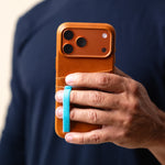 We use premium, fully wrapped full-grain leather, combined with a soft satin-like microfiber lining and an organic cotton elastic finger loop for extra grip and hold.
