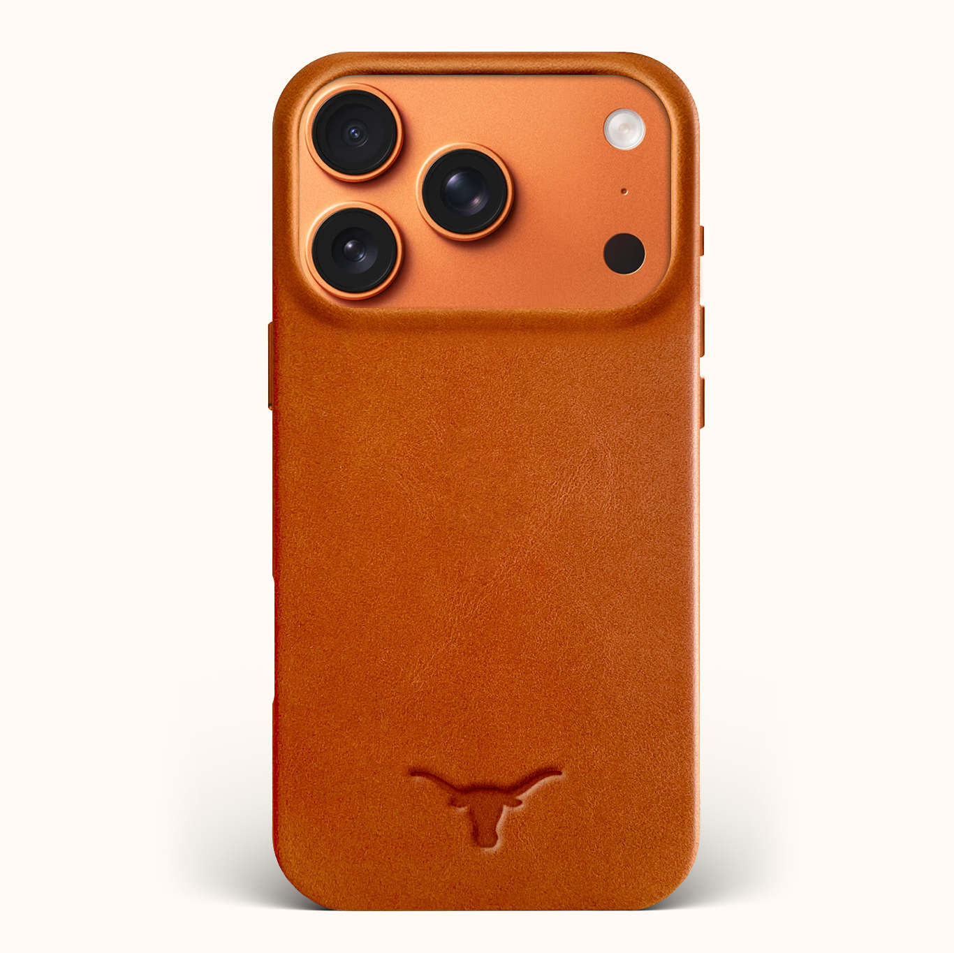 Officially licensed by the University of Texas at Austin, the Minimalist Full-Grain Leather iPhone MagSafe Case in Burnt Orange is a GameDay staple reimagined in luxury form. Crafted from premium full-grain leather, its patented raised-bezel design wraps the camera and edges for a richer, fuller leather experience. An embossed Longhorn logo adds subtle UT pride, while the satin microfiber interior and bumper deliver both protection and refinement. Slim, durable, and built to age beautifully, this heirloom piece keeps your iPhone game-ready with Austin-born craftsmanship and timeless style.