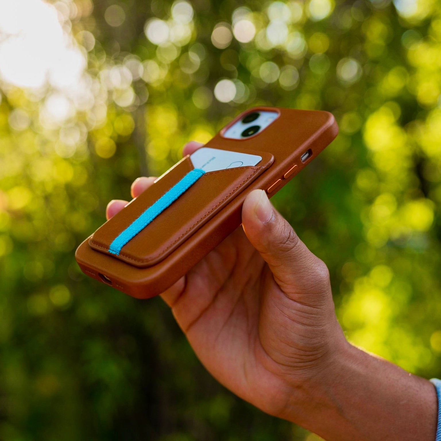 MagSafe wallets should be both functional and beautiful. We created a premium full-grain leather MagSafe Wallet with a v-cut pocket that can fit up to 3 cards and an organic cotton elastic finger loop for optimal grip and hold.