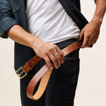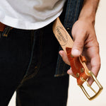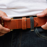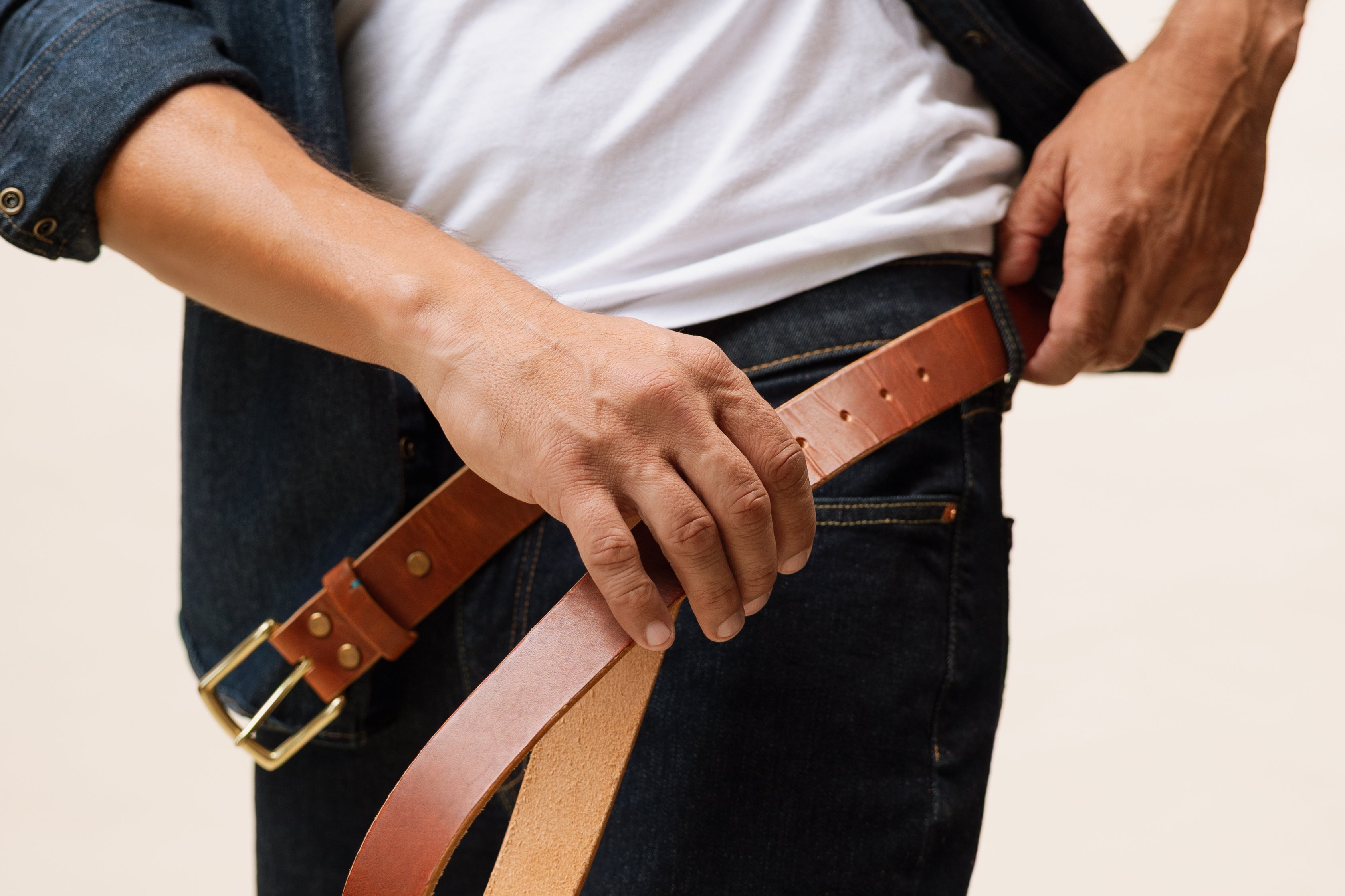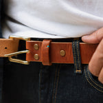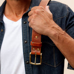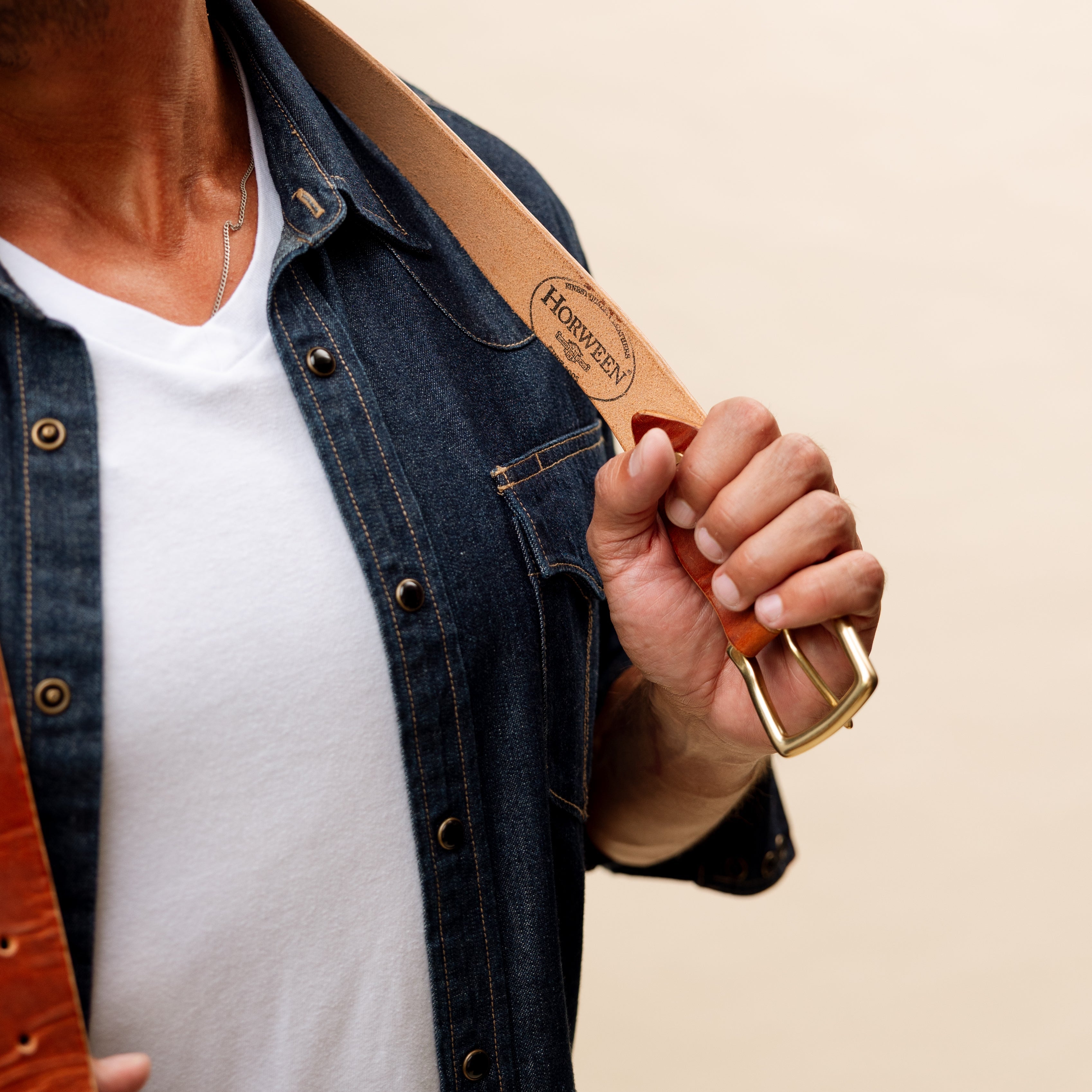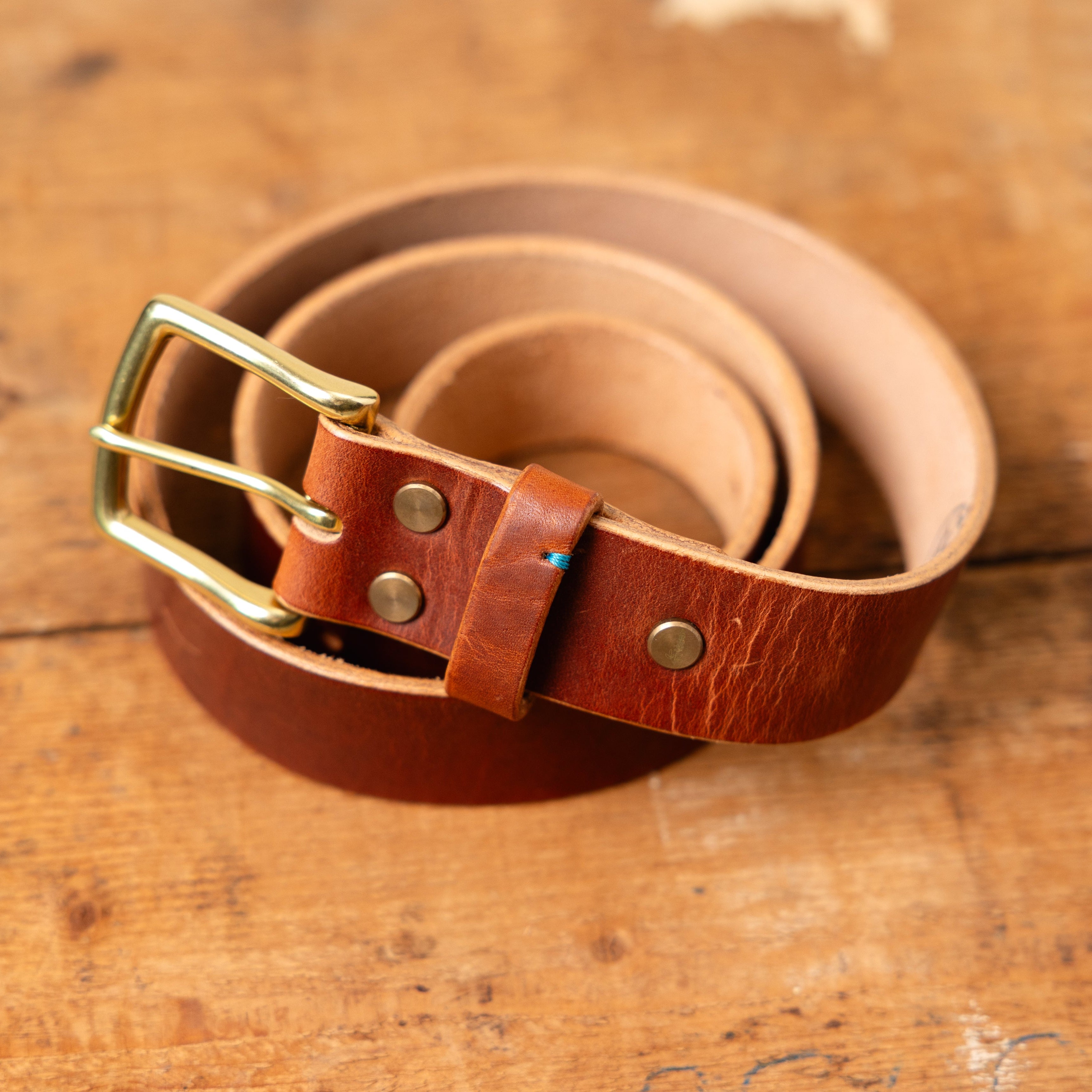 - 1.5” handcrafted belt made from 9–10 oz Horween Dublin leather in English Tan