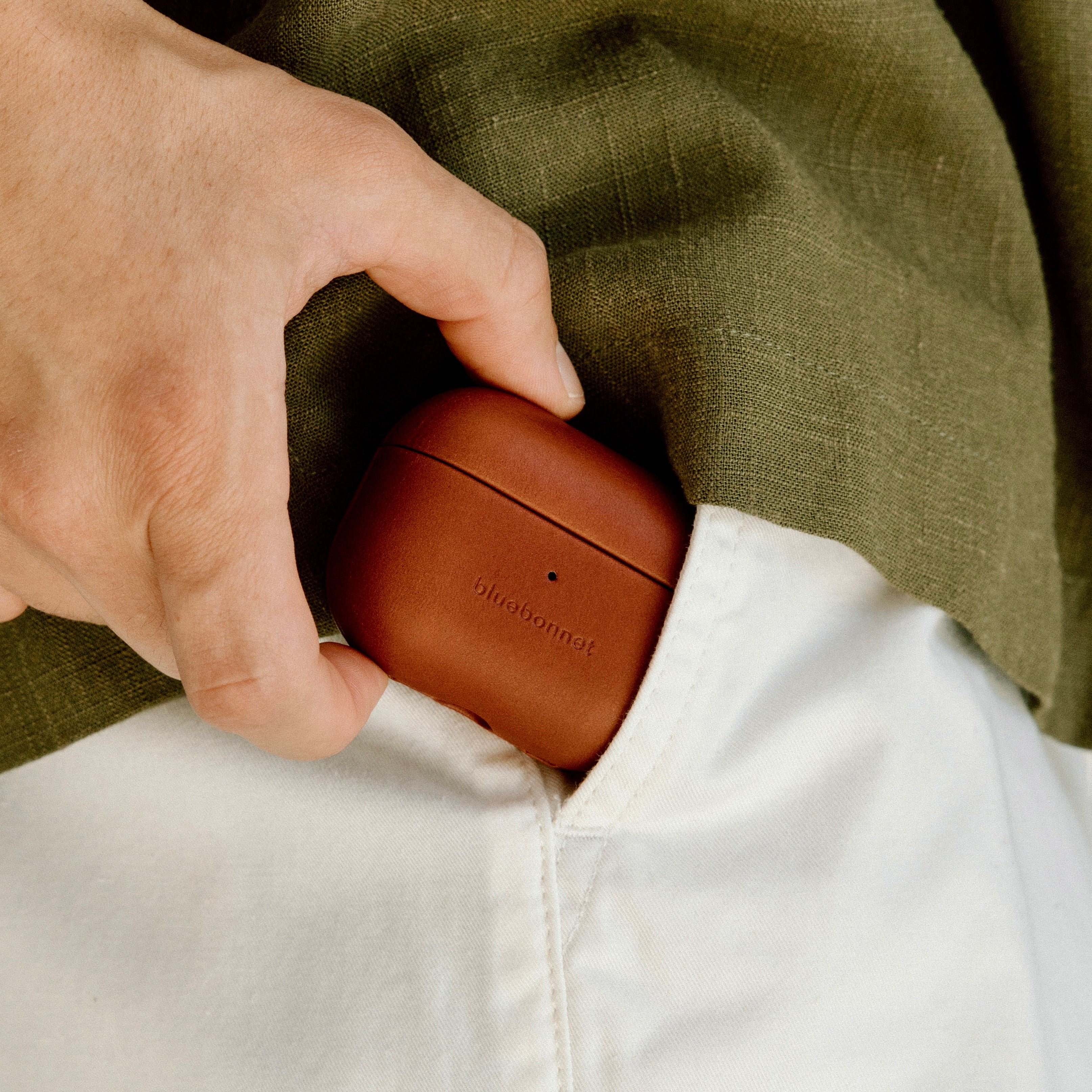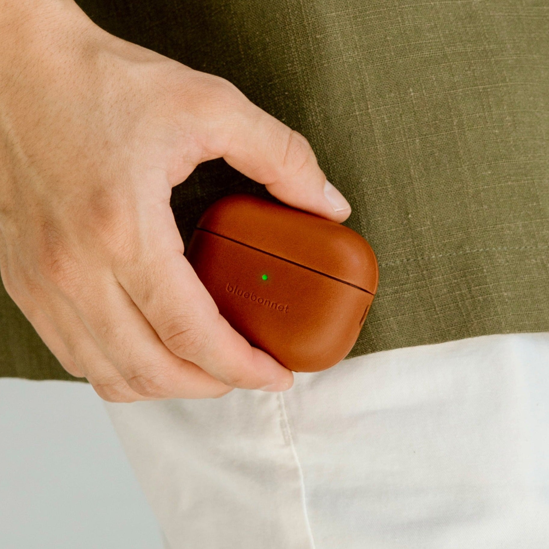 Elevate your AirPods Pro 3 with our luxury Leather AirPods Pro 3 Case in saddle tan leather. Crafted from premium full-grain leather and featuring our signature Bluebonnet blue microfiber lining, this case offers 360-degree protection and wireless charging. Experience sophisticated, everyday elegance with a touch of southern charm.