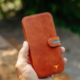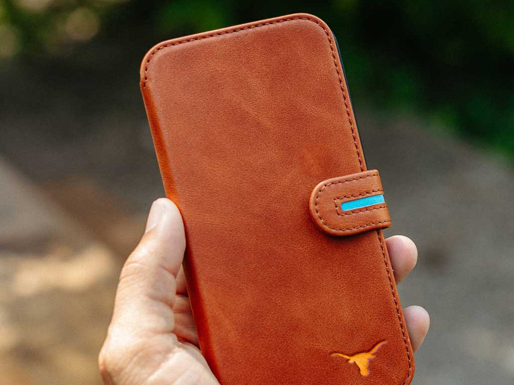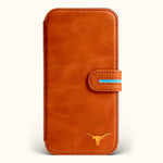 Officially licensed by the University of Texas at Austin, the Executive Leather iPhone Wallet Case Folio in Burnt Orange is a GameDay essential elevated with Bluebonnet craftsmanship. Made from premium full-grain Italian leather, it’s finished with a luxury foiled Longhorn logo and subtle Austin-inspired interior pattern. Multiple card and cash pockets keep you organized and game-ready, while MagSafe compatibility and wireless charging make it effortless for everyday use. With an integrated TPU bumper for superior drop protection, this heirloom piece blends Longhorn pride, Austin roots, and lasting luxury.