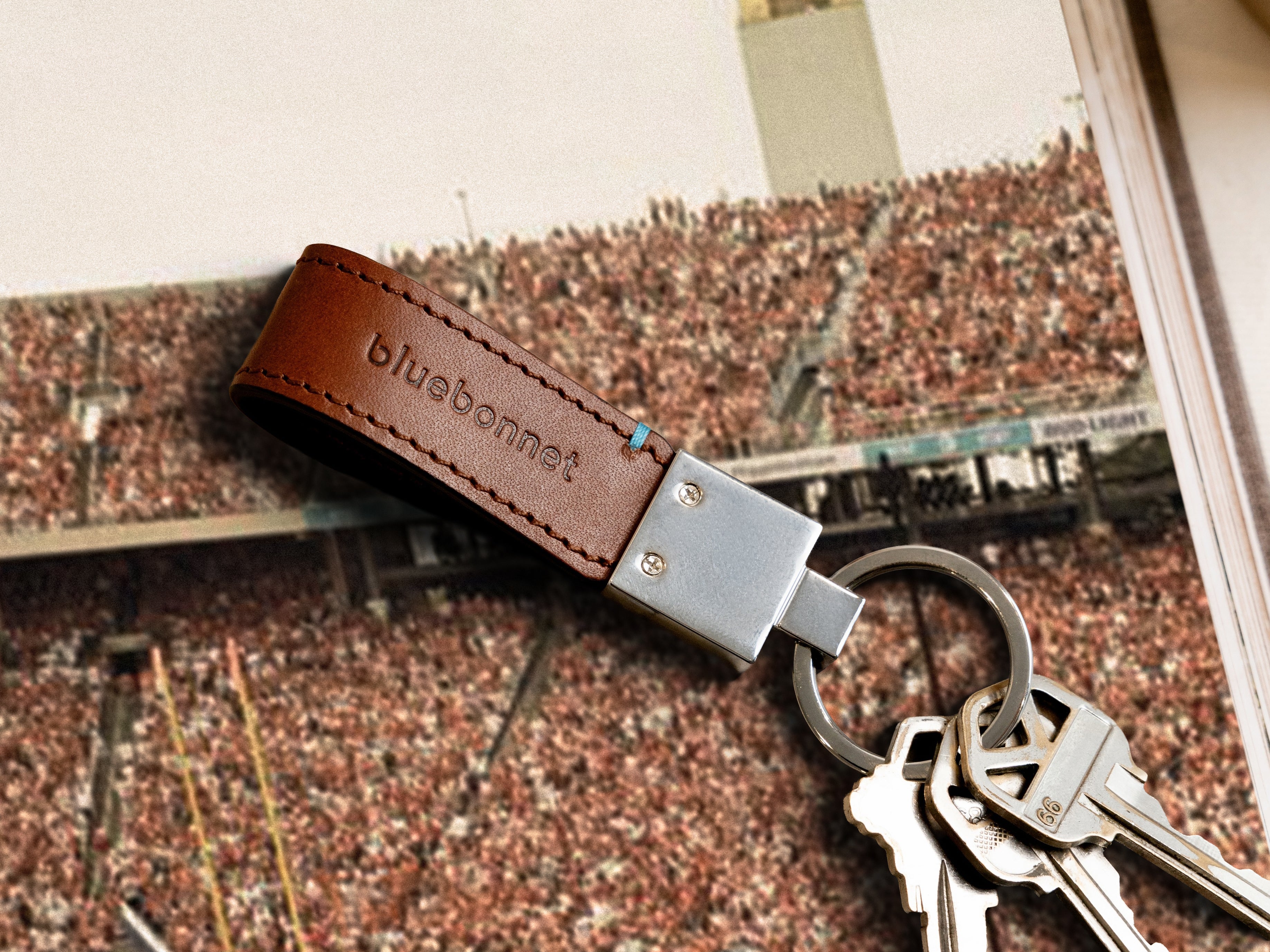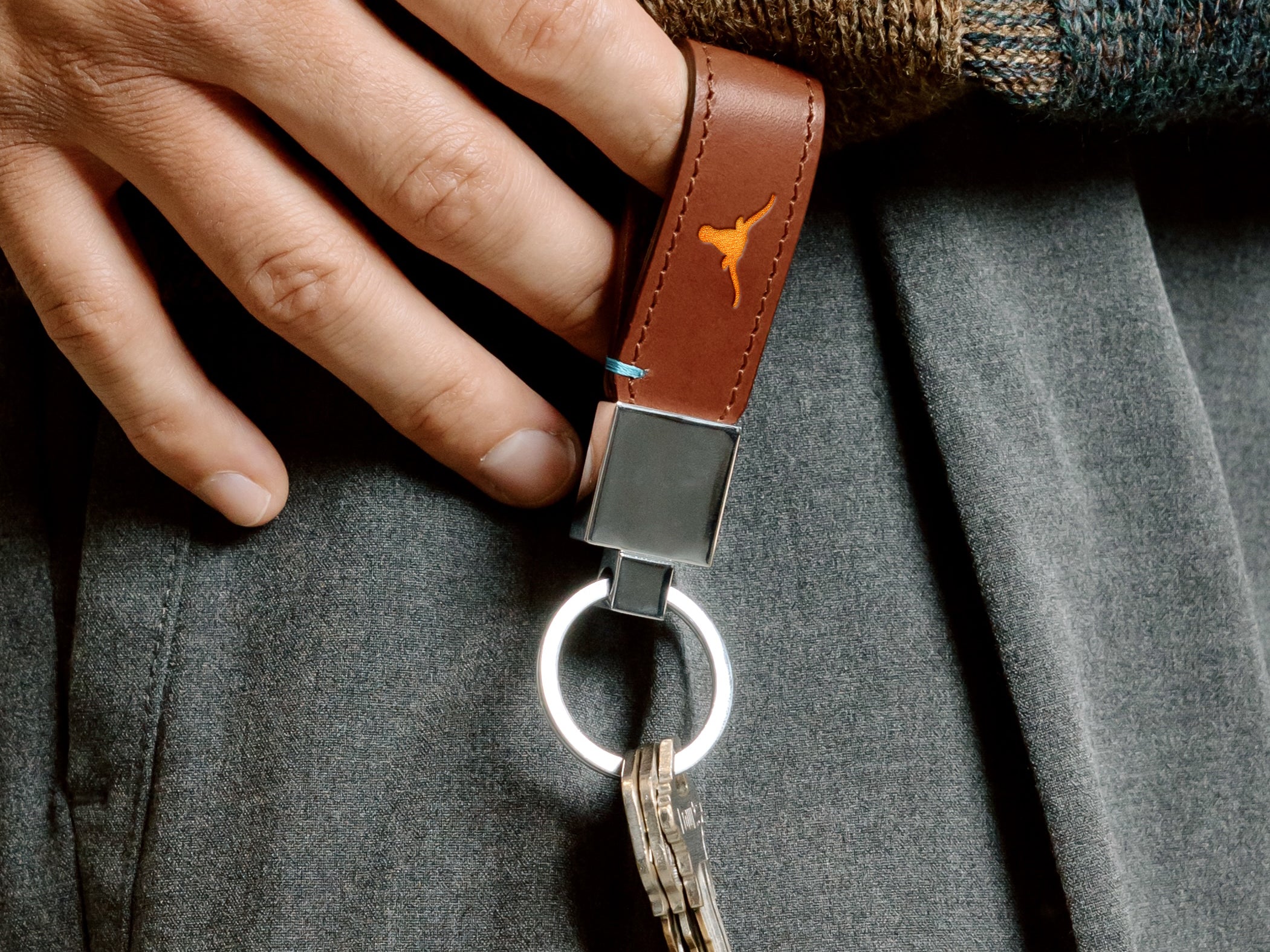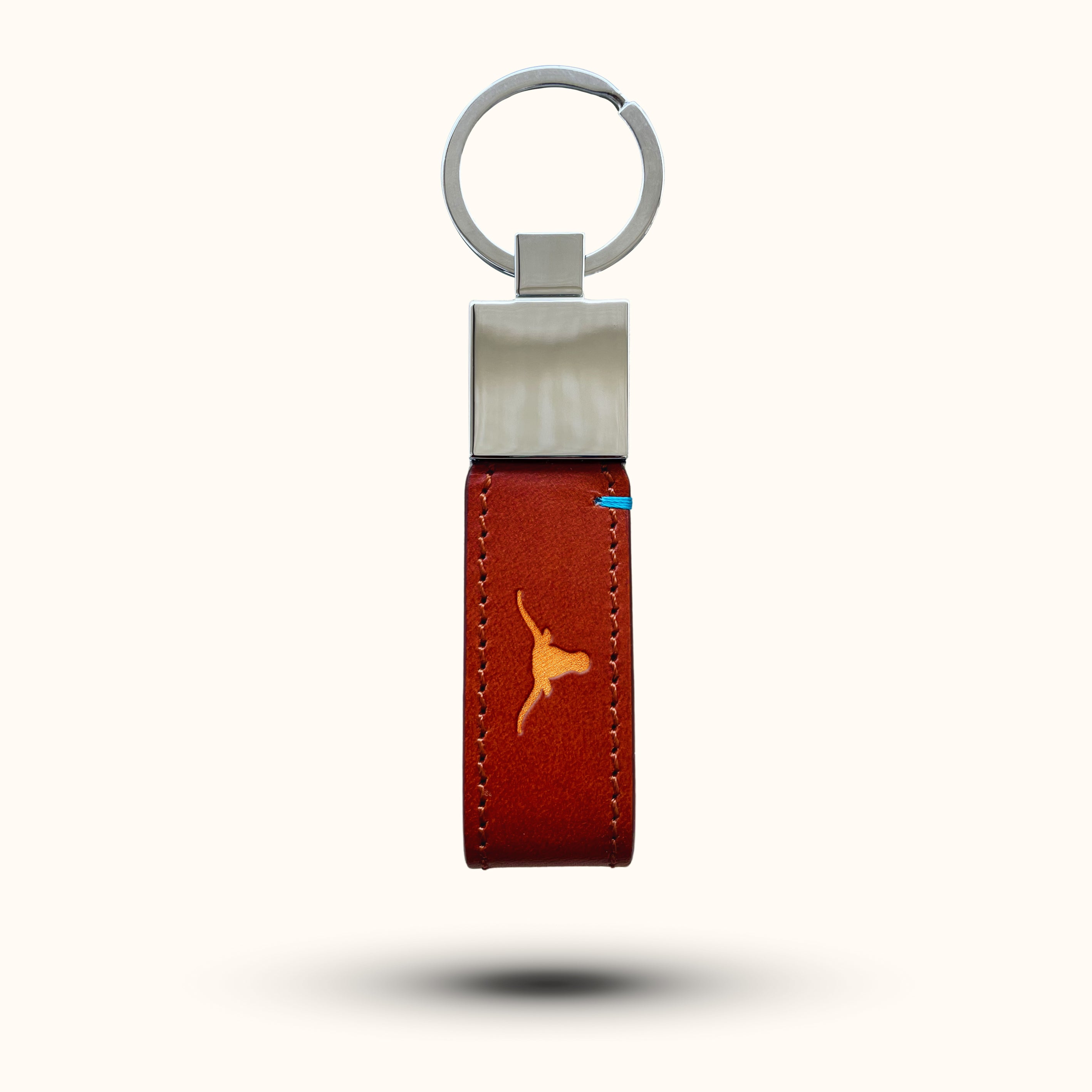Officially licensed by the University of Texas at Austin, this Italian leather key tag is a GameDay essential crafted from premium Tuscan hides. Finished with a foiled Longhorn logo and Bluebonnet’s signature blue thread stitching, it blends timeless design with Longhorn pride. Built to patina beautifully over time, this heirloom piece keeps your keys secure while carrying a touch of luxury every day.